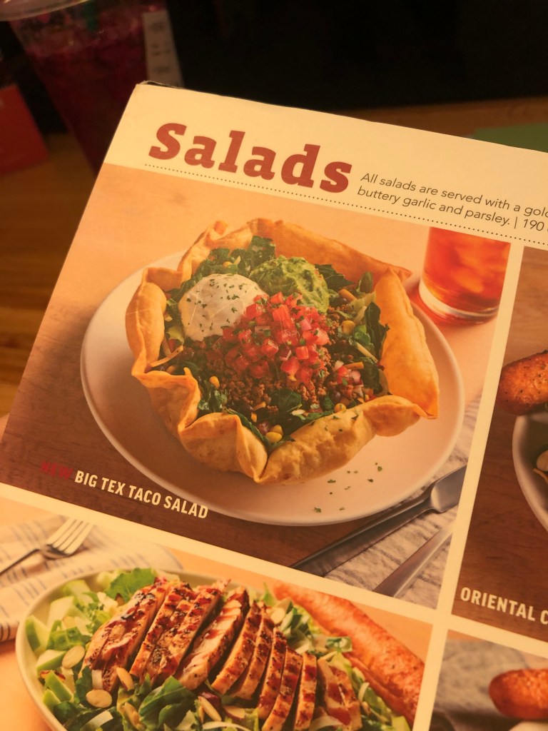 On my Instagram page, I made a post looking at something that I and my Mama came across when eating at an Applebee’s a couple of weeks ago. On the menu, there was a new kind of salad that Applebee’s customers would be able to eat while they dine there. They called it the Big Tex Taco Salad and I would be wrong to say that I didn’t think it looked good. I see guacamole (though mine will always be better) tomatoes, cilantro, beans, and corn. It looked colorful and I am certain that was the purpose to try and intrigue customers to getting it. Not to mention the large edible bowl that it comes with. At first glance, it caught our attention and naturally the next thing we did was look at the food description for the salad bowl.