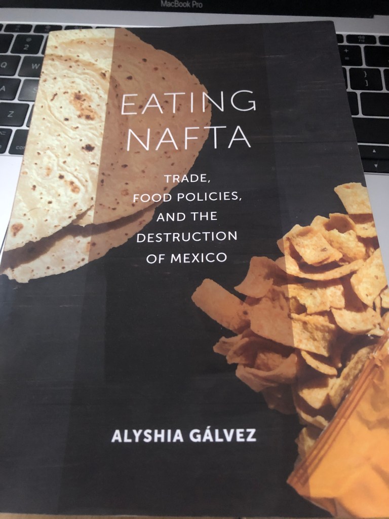 For my Taco Literacy class, the book that we have been reading lately as been Eating NAFTA by Alyshia Gálvez and the conversations that we’ve had with this book have just been amazing. Last week my class and I were able to speak to Gálvez herself and ask her questions that came to us when we read her work. One question that I asked Gálvez pertained to the notion of “organic” and what that term really means as smaller farmers in Mexico growing their own crops can technically be considered “organic.” One of her responses to the question came to the fact that many of those farmers not only are competing with larger industrialized farming from companies that are cheaper than their own corn, but also, these smaller farmers are also unable to purchase the license needed to be labeled as “organic.” It is insane to see just how political that it can get when looking at the farming conditions that Mexican growers encounter. My peers also had great questions to ask about the NAFTA “agreement” to Professor Gálvez and I was just left with more insight in the sphere of policies related to Mexico, and the unfortunate consequences that come with those policies.